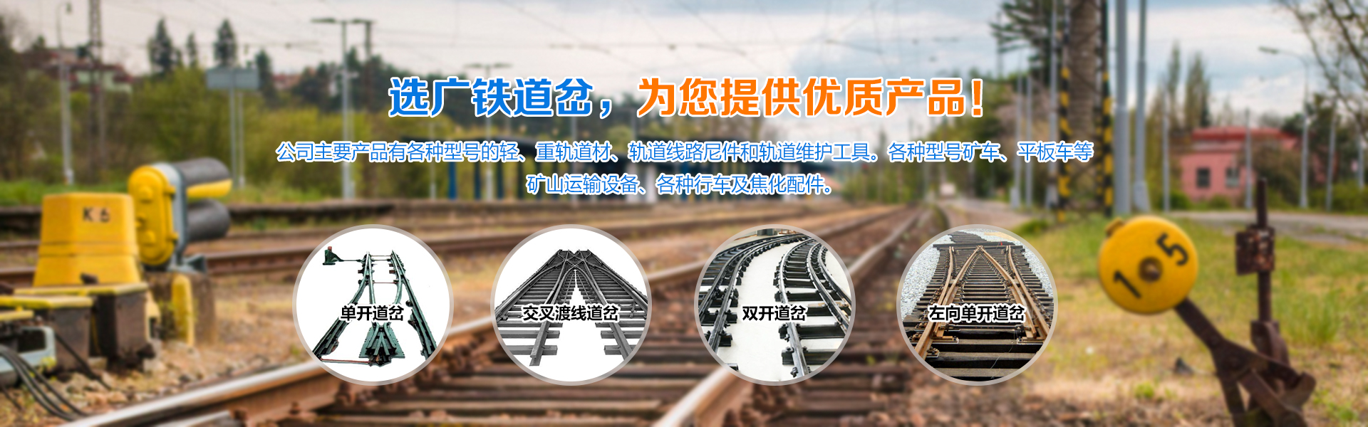林州市廣鐵道岔有限公司擁有大型現(xiàn)代化高精生產(chǎn)設(shè)備及完善的質(zhì)量檢測體系,產(chǎn)品完全符合國家質(zhì)量檢測標(biāo)準(zhǔn),滿足廣大客戶的需求。公司主要產(chǎn)品有各種型號的輕、重軌道材、軌道線路尼件和軌道維護(hù)工具。各種型號礦車、平板車等礦山運(yùn)輸設(shè)備、各種行車及焦化配件。產(chǎn)品覆蓋3大系列200多個(gè)品種。為服務(wù)鐵路、冶金、煤炭郎實(shí)現(xiàn)鐵路道岔運(yùn)輸標(biāo)準(zhǔn)化、現(xiàn)代化、自動化需求,實(shí)現(xiàn)鐵路道岔運(yùn)輸標(biāo)準(zhǔn)化、現(xiàn)代化、自動化需要。